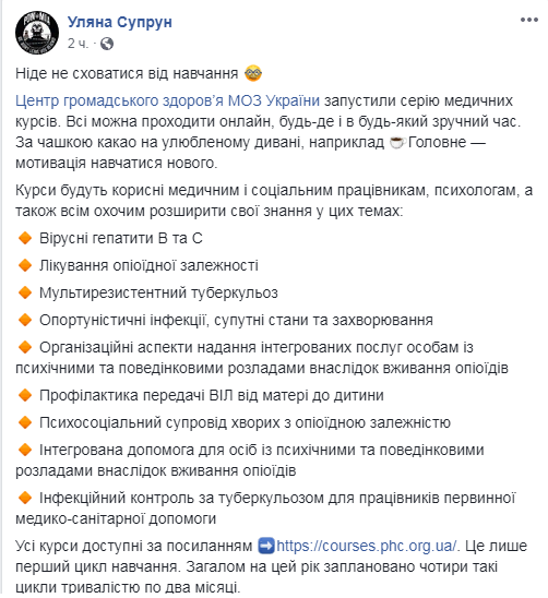 "Центр общественного здоровья Минздрава Украины запустил серию медицинских курсов. Все можно проходить онлайн, в любом месте и в любое удобное время. За чашкой какао на любимом диване, например. Главное - мотивация учиться новому", - уверяют авторы идеи.