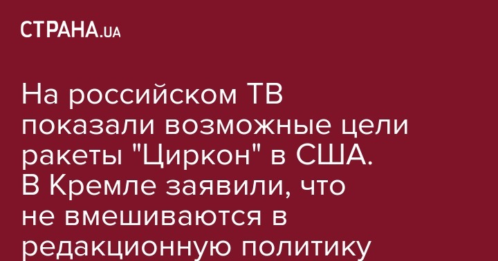 В российской программе "Вести недели", ведущим которой является Дмитрий Кисилев, показали грфику, как российские гиперзвуковые ракеты "Циркон" летят на возможные мишени в США - Пентагон, резиденцию президента Кэмп-Дэвид и т.п. В Кремле поспешили заявить, что "не могут вмешиваться в редакционную политику телеканалов". Об этом сообщает "Интерфакс"