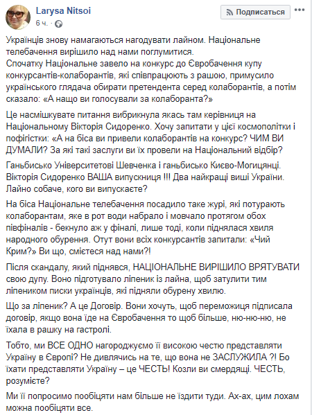 "Национальное телевидение решило над нами поглумиться. Сначала Национальное завело на конкурс на Евровидение кучу конкурсантов-коллаборационистов, сотрудничающих с рашей, заставило украинского зрителя выбирать претендента среди коллаборационистов, а потом сказало: "А зачем вы голосовали за коллаборанта?". Этот насмешливый вопрос выбрыкнула какая-то руководитель на Национальном Виктория Сидоренко. Хочу спросить у этой космополитки и пофигистки: "А на кой черт вы привели коллаборационистов на конкурс? Чем вы думали? За какие такие заслуги вы их провели на Национальный отбор?", - написала Ницой.