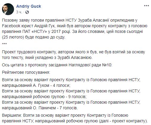 "Сегодня иск будет подан в суд", - сообщил он. Юрист также обнародовал полный текст (кроме определенной информации) иска З.Аласания (Zurab Alasania). "Цель публикации – открытость к конструктиву и дать достаточно времени наблюдательному совету для совете реакции", - уточнил А.Гук.