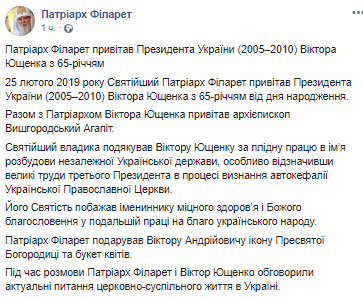 "25 февраля 2019 Святейший Патриарх Филарет поздравил Президента Украины (2005-2010) Виктора Ющенко с 65-летием со дня рождения. Вместе с Патриархом Виктора Ющенко поздравил архиепископ Вышгородский Агапит.