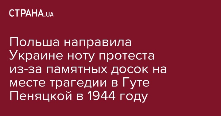 Польские дипломаты выступили с протестом против двух мемориальных досок во Львовской области: одна - убитым полякам, вторая - убитым украинцам. Посольство Республики Польша в Киеве выразило Министерству иностранных дел Украины ноту протеста в связи с "попытками релятивировать преступление в Гуте Пеняцкой". Об этом заявила пресс-секретарь посольства Эва Сувара, сообщает Польское радио.