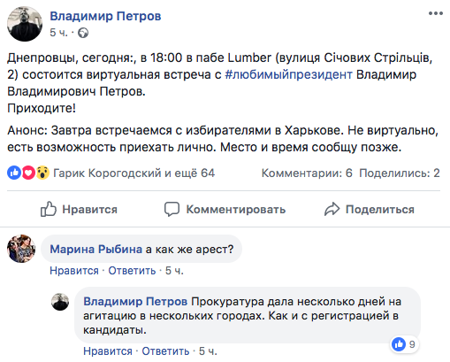 "Днепровцы, сегодня состоится виртуальная встреча с #любимыйпрезидент Владимир Владимирович Петров. Приходите! Анонс: Завтра встречаемся с избирателями в Харькове. Не виртуально, есть возможность приехать лично. Место и время сообщу позже", - написал Петров в Facebook.