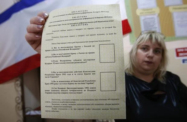 6 марта новоявленные власти Крыма объявили об изменении формулировки вопроса референдума и переносе самого голосования на 16 марта 2014 года. На референдум были вынесены два вопроса: присоединение Крыма к России на правах субъекта федерации или восстановление Конституции 1992 года По ней Крым оставался в составе Украины, но был практически полностью от нее независим.