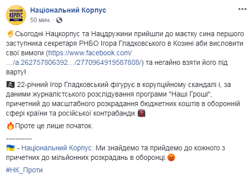 Члены "Нацкорпуса" и "Нацдружин" пришли к дому сына первого заместителя секретаря СНБО Игоря Гладковского в Козине, что в Киевской области. Они устроили митинг.