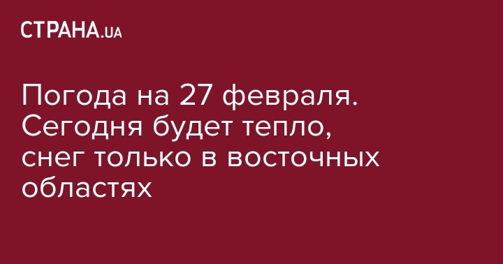 В среду, 27 февраля, в большей части областей Украины будет тепло, пасмурно, но без осадков. Об этом свидетельствует прогноз на сайте Укргидрометцентра