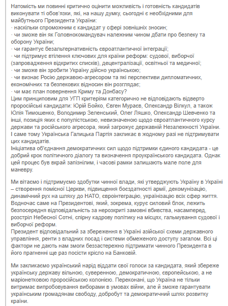 "Принципиальным для УГП критериям категорически не отвечают откровенно пророссийские кандидаты Юрий Бойко, Евгений Мураев, Александр Вилкул, а также Юлия Тимошенко, Владимир Зеленский, Олег Ляшко, Александр Шевченко и другие, позиция которых является популистской", - говорится в заявлении.