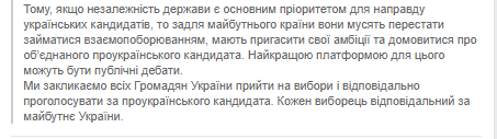 В заявлении также содержится похвала "достижений действующей власти": поместной церкви, декоммунизации, евроинтеграции, украинизации, хотя и указывается, что некоторые моменты не дают возможности поддерживать Петра Порошенко "безапелляционно". Отметим, что Роман Головенко является не просто членом партии, а и одним из руководителей и членом Совета Киевской городской организации Украинской галицкой партии.