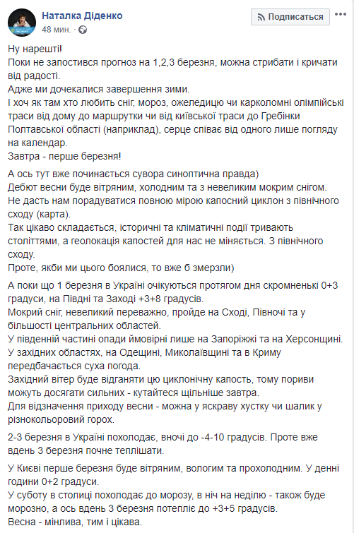 Также она сообщила, что 2 и 3 марта в Украине вновь похолодает, ночью -4…-10 градусов. Но уже днем 3 марта станет теплее.