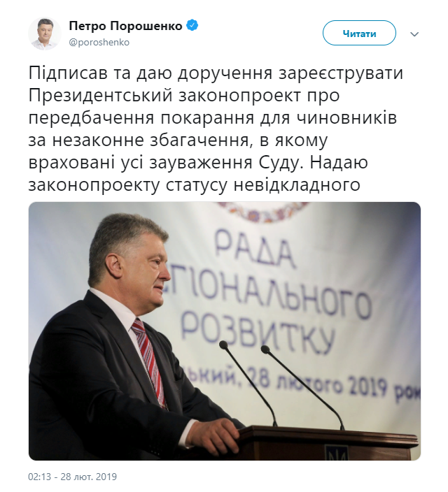 "Подписал и даю поручение зарегистрировать президентский законопроект о предусмотренном наказании для чиновников за незаконное обогащение, в котором учтены все замечания суда. Предоставляю законопроекту статус неотложного", - заявил Порошенко.