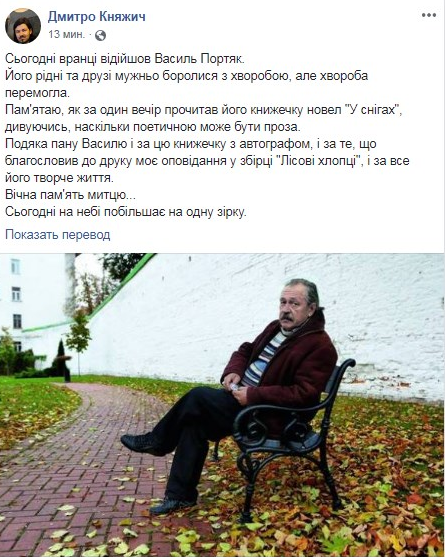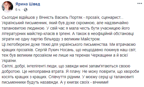 "Умер Василий Портяк, один из лучших современных прозаиков, глубокий, немногословный, настоящий. В украинской литературе настоящему нужно умереть, чтобы его ценить. Уважать мертвых проще, чем живых", - написала поэтесса Галина Крук.