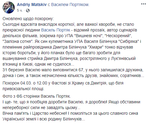 Отметим, что Василий Портяк родился в 1952 году. Прощание с писателем состоится 3 марта по адресу ул. Шевченко, 65 в Фастове, в храме святого Димитрия. Похороны состоятся 4 марта.