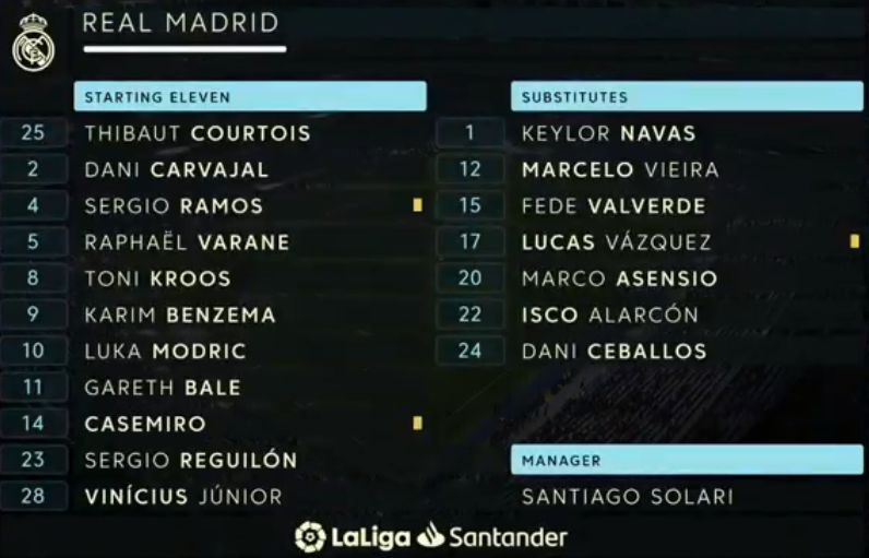 Куртуа - защитники Карвахаль, Варан, Рамос, Регульон - полузащитники Модрич, Каземиру, Кроос - нападающие Бэйл, Бензема, Винисиус
