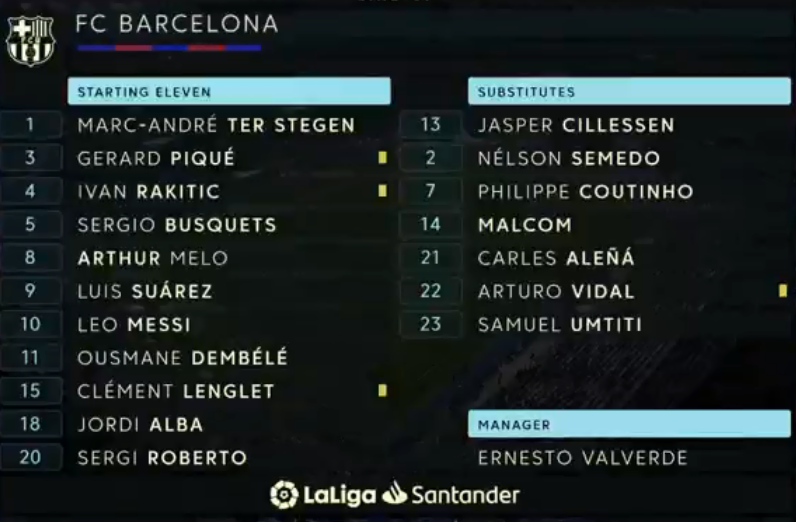 Тер Штеген - защитники Серхио Роберто, Пике, Лангле, Альба - полузащитники Ракитич,Бускетс,Артур - нападающие Месси, Суарес, Дембеле