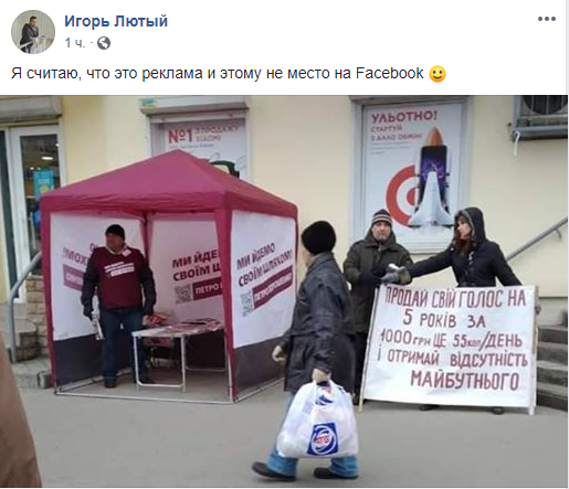 "Я считаю, что это реклама и этому не место на Facebook", - подписал опубликованный снимок Игорь Лютый.