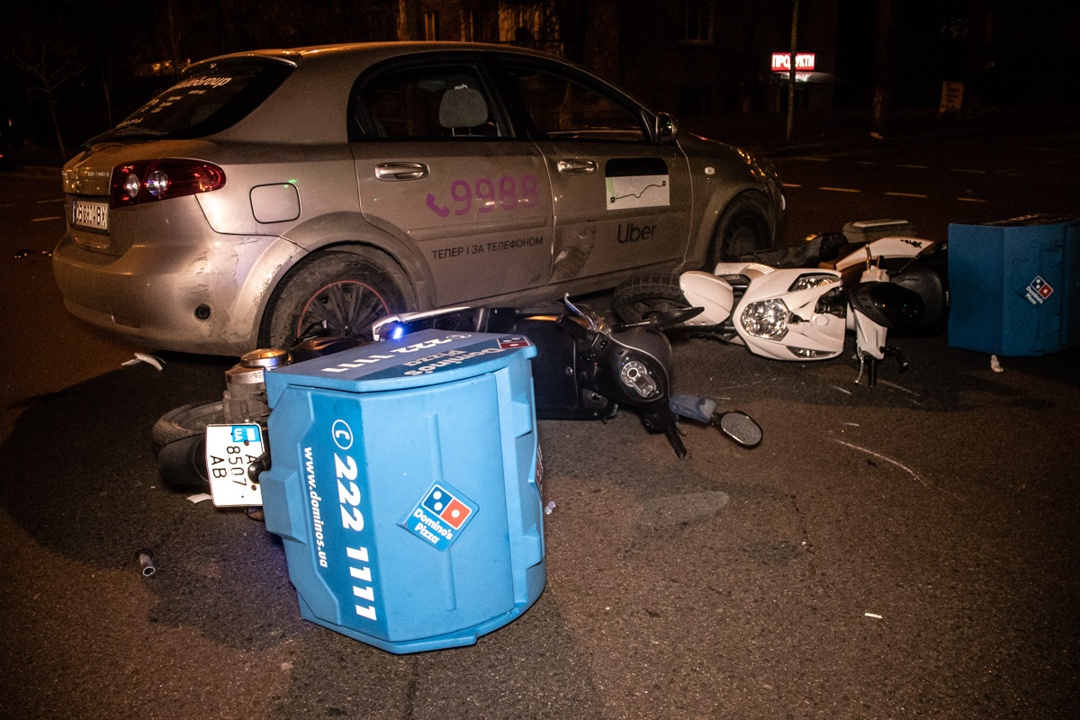 В Киеве на пересечении улиц Михаила Бойчука и профессора Подвысоцкого произошла авария с участием службы такси Uber и двоих курьеров Domino’s Pizza на скутерах. Как сообщает "Информатор", обоих курьеров госпитализировали.