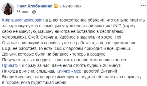 "Киевтранспарксервис на днях торжественно объявил, что отныне платить за парковку нужно с помощью улучшеного приложения UNIP (карму свою не минусую, машину никогда не оставляю в бесплатных чагарныках). Окей. Скачала. Удобное (надеюсь) и яркое. Но! Старые приложухи и сервисы уже не работают, а новое приложение ЕЩЕ не работает. То есть, смс с паролем приходит и всё, финиш. Деньги, которые были на балансе - теперь в воздухе", - отметила она.