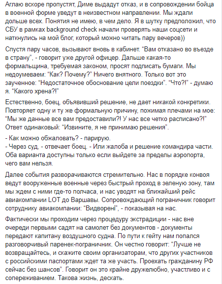 "Хотя по процедуре, при экстрадиции, экстрадирующая сторона должна извещать принимающую о прибытии "выдворенных", украинцы полякам ничего не сообщают. КВС связывается с пограничными службами варшавского аэропорта, для которых наше прибытие в таком статусе - новость. Из-за нас старшему бортпроводнику и КВС приходится задерживаться, мы ждем в самолете добрые минут 15, пока польские пограничники на специальной машине не приедут за нами. Нас садят в салон, по-прежнему не отдавая документы, и мы с мигалками на спецмашине пограничной службы Польши гоним что есть мочи к зданию терминала", - пишет киевлянин.