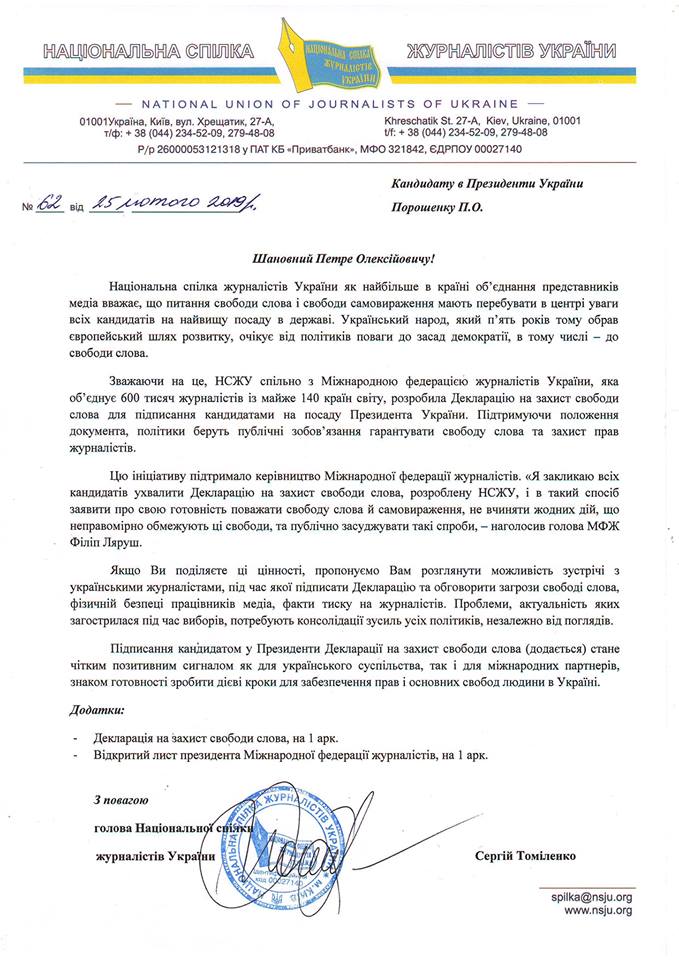 Национальный союз журналистов Украины (НСЖУ) обратился к президенту Петру Порошенко (как кандидату на второй срок - Прим.Ред.) с предложением встретиться с украинскими журналистами и обсудить угрозы свободе слова, состояние физической безопасности работников медиа и факты давления на журналистов.