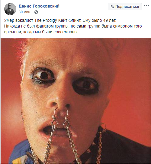 "Умер вокалист The Prodigy Кейт Флинт. Ему было 49 лет.