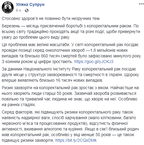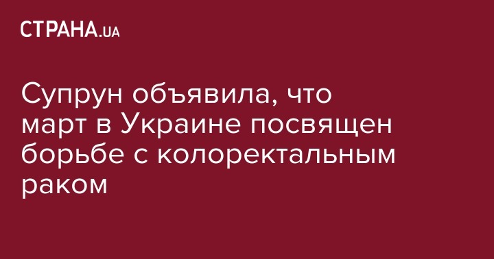 "Эта проблема имеет большие масштабы. В мире колоректальный рак занимает ведущие позиции среди онкологических болезней - 1800000 новых случаев и около 860 000 смертей было зафиксировано в прошлом году. С каждым годом эти цифры растут", - отметила на своей Фейсбук-странице глава Минздрава Уляна Супрун.