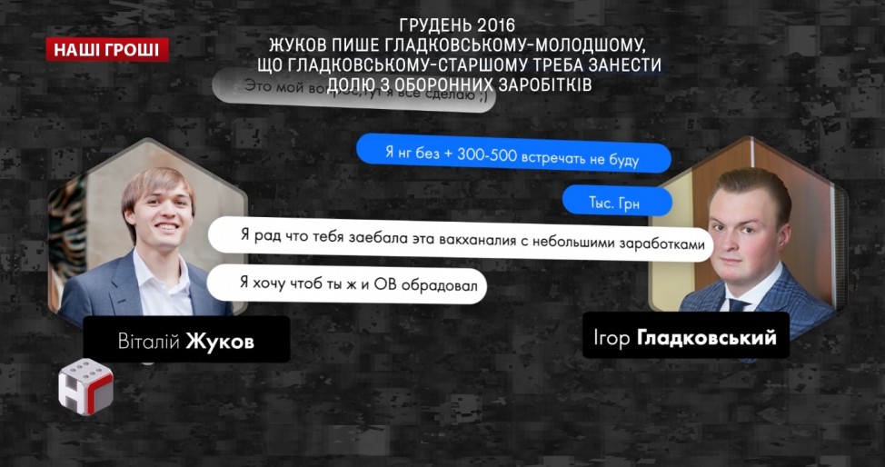 3. Судя по материалам из телефона, преступная группа действовала в составе Виталия Жукова, Андрея Рогозы, и сына секретаря СНБО Гладковского Игоря. К деятельности преступной группы мог быть причастен Олег Гладковский-старший, нынешний директор "Укроборонпрома" Павел Букин, и судя по всему - еще целый ряд различных должностных лиц. Гладковский им был нужен, чтобы делать "крышу", на случай как раз вот таких расследований правоохранительных органов, мошенники понимали, что причастность сына ближайшего друга президента Порошенко к афере надежно защищает их от больших неприятностей.