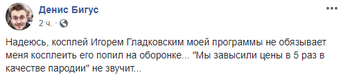 "Надеюсь, косплей Игорем Гладковским моей программы не обязывает меня косплеить его попил на оборонке... "Мы завысили цены в 5 раз в качестве пародии" не звучит..", - реагирует автор программы Денис Бигус.