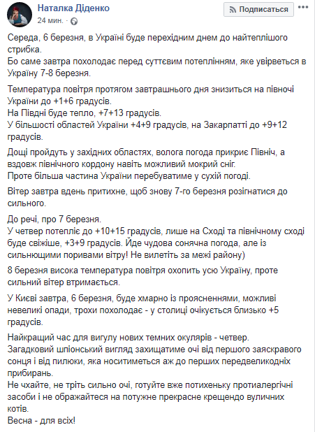 В среду, 6 марта, Украину ожидает похолодание перед потеплением, которое 7-8 марта ожидает жителей страны. Об этом на своей странице в Facebook сообщила синоптик Наталья Диденко.
