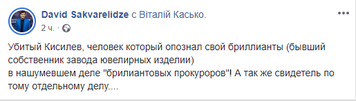 "Убитый Киселев, человек который опознал свои бриллианты (бывший собственник завода ювелирных изделий) в нашумевшем деле "бриллиантовых прокуроров"! А так же свидетель по тому отдельному делу....", - написал Сакварелидзе на своей странице в соцсети Facebook во вторник днем.
