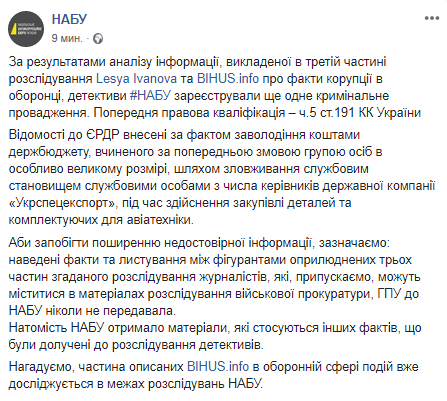 После публикации третьей части расследования журналистов программы "Наши гроши" Бигуса и Ивановой о хищениях окружения президента Порошенко в сфере оборонной промышленности Украины Национальное антикоррупционное бюро зарегистрировали еще одно уголовное производство по данному факту. Об этом сообщает пресс-служба НАБУ на странице в Facebook.