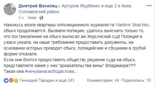 "Вызвали полицию, удалось выяснить только то, что постановление на обыск выписал аж Херсонский суд! Полиция в ужасе уехала, на наше требование предоставить документы, на основании которых проводят обыск, полицейские и сбушники в грубой форме отказали", - отметил Василец. "Если они боятся предоставить обществу решение суда на обыск, представляете какие у них "доказательства вины" Владимира?", - резюмировал он.