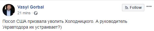 "Посол США призвала уволить Холодницкого. А руководитель "Укравтодора" их устраивает?", - пишет Горбаль.