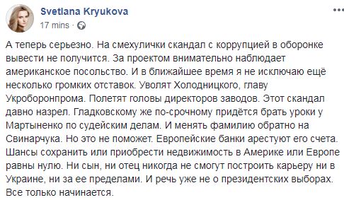 "На смехулички скандал с коррупцией в оборонке вывести не получится. За проектом внимательно наблюдает американское посольство. И в ближайшее время я не исключаю ещё несколько громких отставок. Уволят Холодницкого, главу Укроборонпрома. Полетят головы директоров заводов. Этот скандал давно назрел. Гладковскому же по-срочному придётся брать уроки у Мартыненко по судейским делам. И менять фамилию обратно на Свинарчука. Но это не поможет. Европейские банки арестуют его счета. Шансы сохранить или приобрести недвижимость в Америке или Европе равны нулю. Ни сын, ни отец никогда не смогут построить карьеру ни в Украине, ни за ее пределами. И речь уже не о президентских выборах. Все только начинается", - пишет Светлана в своем посте на странице соцсети.