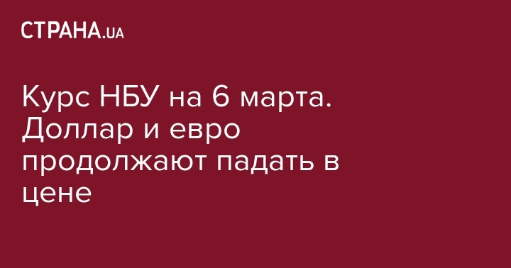 В среду, 6 марта, Национальный банк Украины (НБУ) установил официальный курс основных валют по отношению к гривне. По сравнению с предыдущим банковским днем доллар подешевел еще на 6 копеек. Об этом свидетельствуют данные, размещенные на сайте регулятора