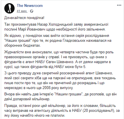 Евгений Шевченко уже неделю пишет посты в соцсетях о том, что он не причастен к хищениям, 5 марта он даже дал интервью "Нашим грошам", где рассказал, что он дважды долларовый миллионер. Правда, последние годы этот миллионер, по его же словам, большую часть времени тратил на агентскую деятельность в НАБУ, за которую ему якобы ничего не платили.