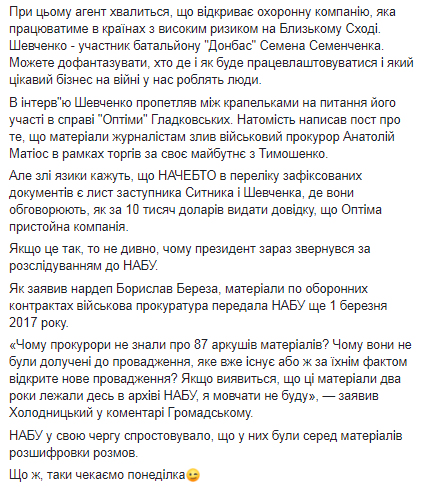 "Если это так, то неудивительно, почему президент сейчас обратился за расследованием в НАБУ. Как заявил нардеп Борислав Береза, ​​материалы по оборонным контрактам военная прокуратура передала НАБУ еще 1 марта 2017 года... НАБУ в свою очередь опровергало, что у них были среди материалов расшифровки разговоров", - сказано в сообщении.