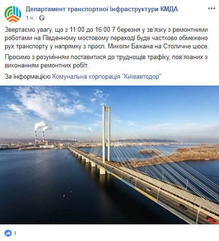 В сообщении идет речь о том, что 7 марта на протяжении пяти часов: с 11:00 до 16:00 - будут вестись ремонтные работы. Именно поэтому движение транспорта по направлению с проспекта Николая Бажана на Столичное шоссе будет частично ограничено в указанное время. Водителям рекомендуется участь это при составлении маршрутов на 7 марта.