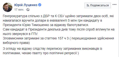 Сотрудники Генеральной прокуратуры Украины вместе с оперативниками СБУ только что задержали двух лиц, которые пытались вручить взятку в 5 миллионов гривен кандидату в президенты Юрию Тимошенко за то, чтобы он отказался баллотироваться. Об этом сообщил на своей странице в Facebook глава Генпрокуратуры Юрий Луценко.