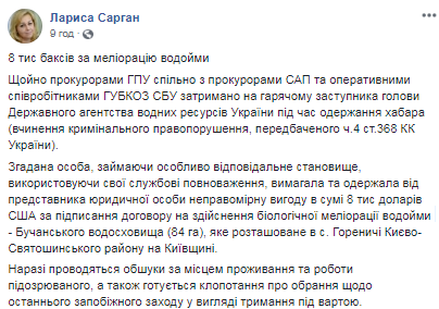 "Прокуроры ГПУ совместно с прокурорами САП и оперативными сотрудниками СБУ задержали с поличным заместителя председателя Государственного агентства водных ресурсов Украины во время получения взятки (уголовное преступление, предусмотренное ч.4 ст.368 УК Украины).