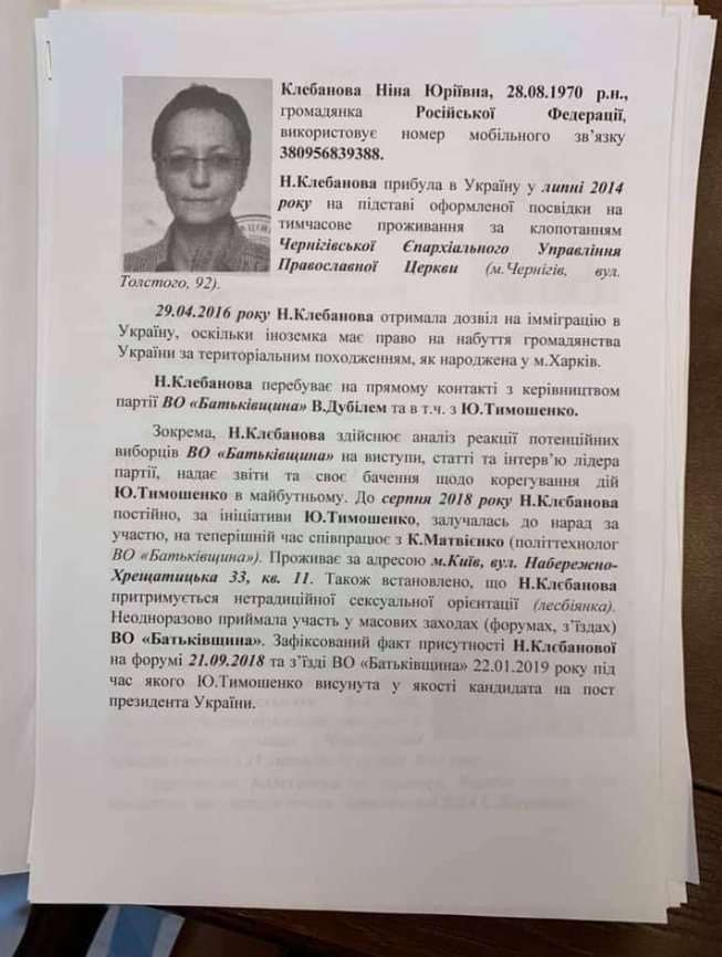 Так, оперативная справка была опубликована на гражданку Российской Федерации Клебанову Нину Юрьевну 1970 года рождения. Отметим, что в справке указывается используемый Клебановой номер телефона. Также сообщается, что Клебанова состоит на прямом контакте с руководством ВО "Батькивщина" и непосредственно с Юлией Тимошенко.
