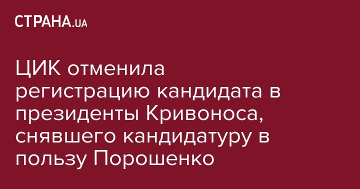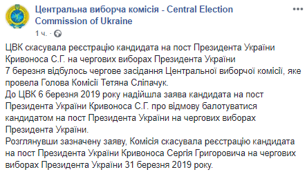 Уточняется, что 7 марта состоялось очередное заседание комиссии. "В ЦИК 6 марта 2019 года поступило заявление кандидата на пост президента Украины Кривоноса С.Г. об отказе баллотироваться кандидатом. Рассмотрев указанное заявление, комиссия отменила регистрацию кандидата на пост президента Украины Кривоноса Сергея Григорьевича на очередных выборах президента Украины 31 марта 2019 года", - говорится в сообщении.
