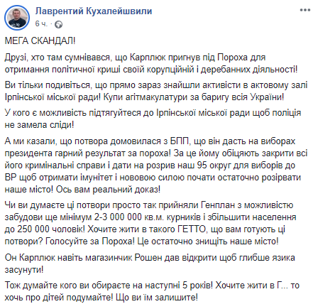 "Друзья, кто там сомневался, что Карплюк прыгнул под Пороха для получения политической крыши своей коррупционной и деребанной деятельности! Вы только посмотрите, что прямо сейчас нашли активисты в актовом зале Ирпенского городского совета! Купи агитмакулатуры за барыгу всея Украины! У кого есть возможность подтягивайтесь к Ирпенскому городскому совету, чтобы полиция не замела следы!"- говорится в сообщении.
