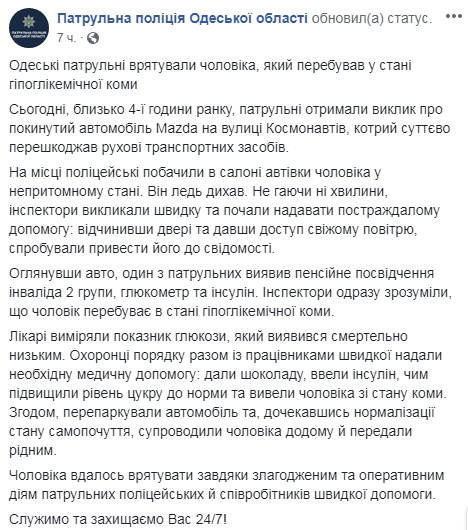 "Стражи порядка вместе с работниками "скорой" оказали необходимую медицинскую помощь: дали шоколада, ввели инсулин, чем повысили уровень сахара в норму и вывели мужчину из состояния комы. Впоследствии, перепарковали автомобиль и, дождавшись нормализации состояния самочувствия, сопроводили мужчину домой и передали родным", - отметили в патрульной полиции.