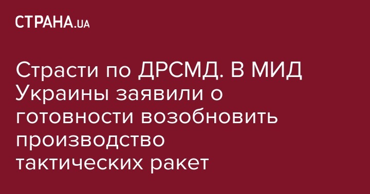 Украина может создавать ракетное оружие, призванное обеспечить должный уровень  обороноспособности страны. Об этом сообщает МИД в связи с фактическим разрывом Договора о ликвидации ракет средней и меньшей дальности (ДРСМД) между США и Россией.