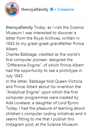 В посте также сказано, что Бэббидж стоял у истоков создания компьютера. В своем письме он рассказывает Альберту об изобретении "аналитического двигателя", на основе которого впоследствии были созданы первые компьютерные программы.