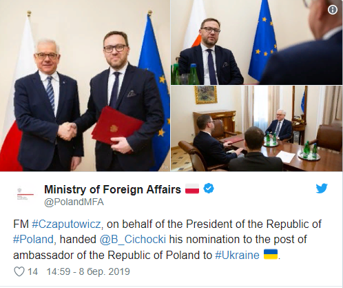 Министр иностранных дел Польши Яцек Чапутович номинировал своего зама Бартоша Цихоцкого на пост нового посла в Украине. Об этом польский МИД сообщил на своей официальной странице в Twitter 8 марта.