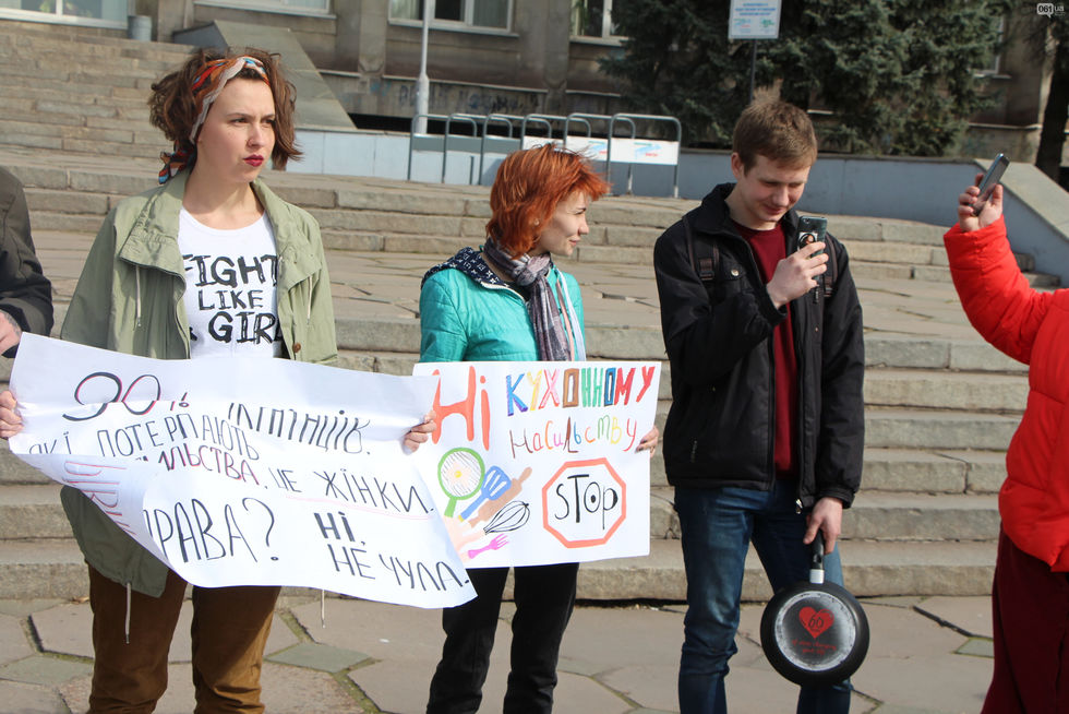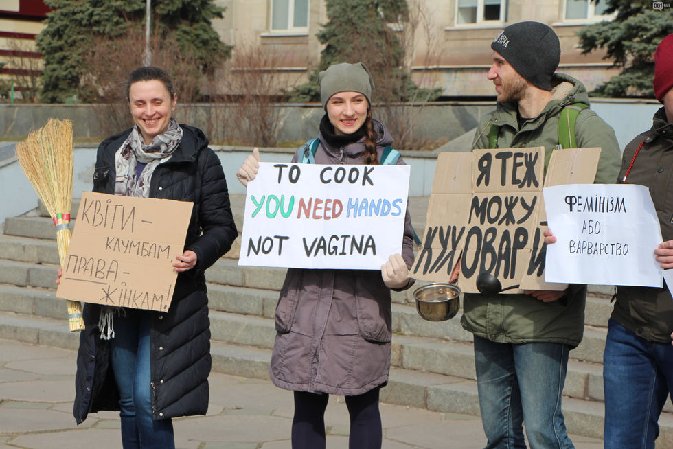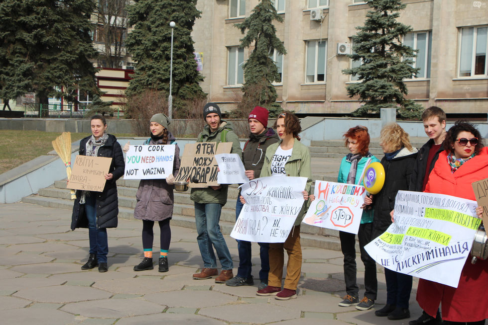 8 марта в Запорожье был проведен митинг под лозунгом "Женщина – не кухонный комбайн". Как передает местное издание 061.ua, мероприятие состоялось на площади возле библиотеки. Местные жители пришли на акции вместе с кухонными приборами, вениками и плакатами "Феминизм или варварство", "Поплакала и стоп? Женщины – не фиалки", "Я тоже могу готовить", "Цветы – клумбам, права – женщинам", "Нет кухонному насилию", "Мужчины не боятся равенства" и другими.