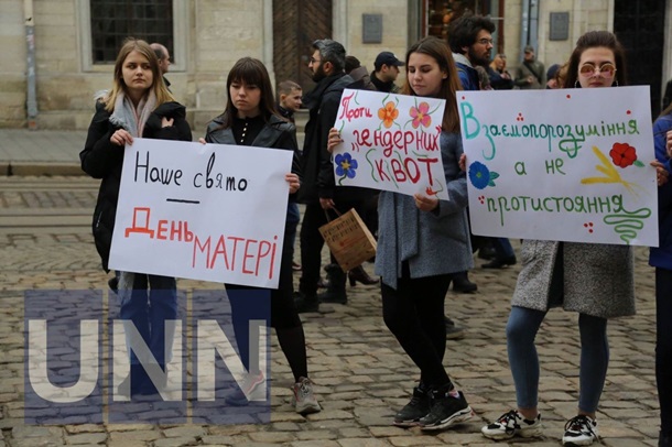 Как сообщает УНН, в центре Львова женщины пришли с плакатами, на которых было написано "Мое тело - мое дело", "Вставай за права женщин" и другие. Кроме женщин, участие в акции принимали и мужчины. При этом в городе состоялось одновременно два митинга: с правой стороны площади Рынок расположились с плакатами борцы за права женщин, слева – девушки-"антифеминистки". Между ними пришлось стоять полиции.