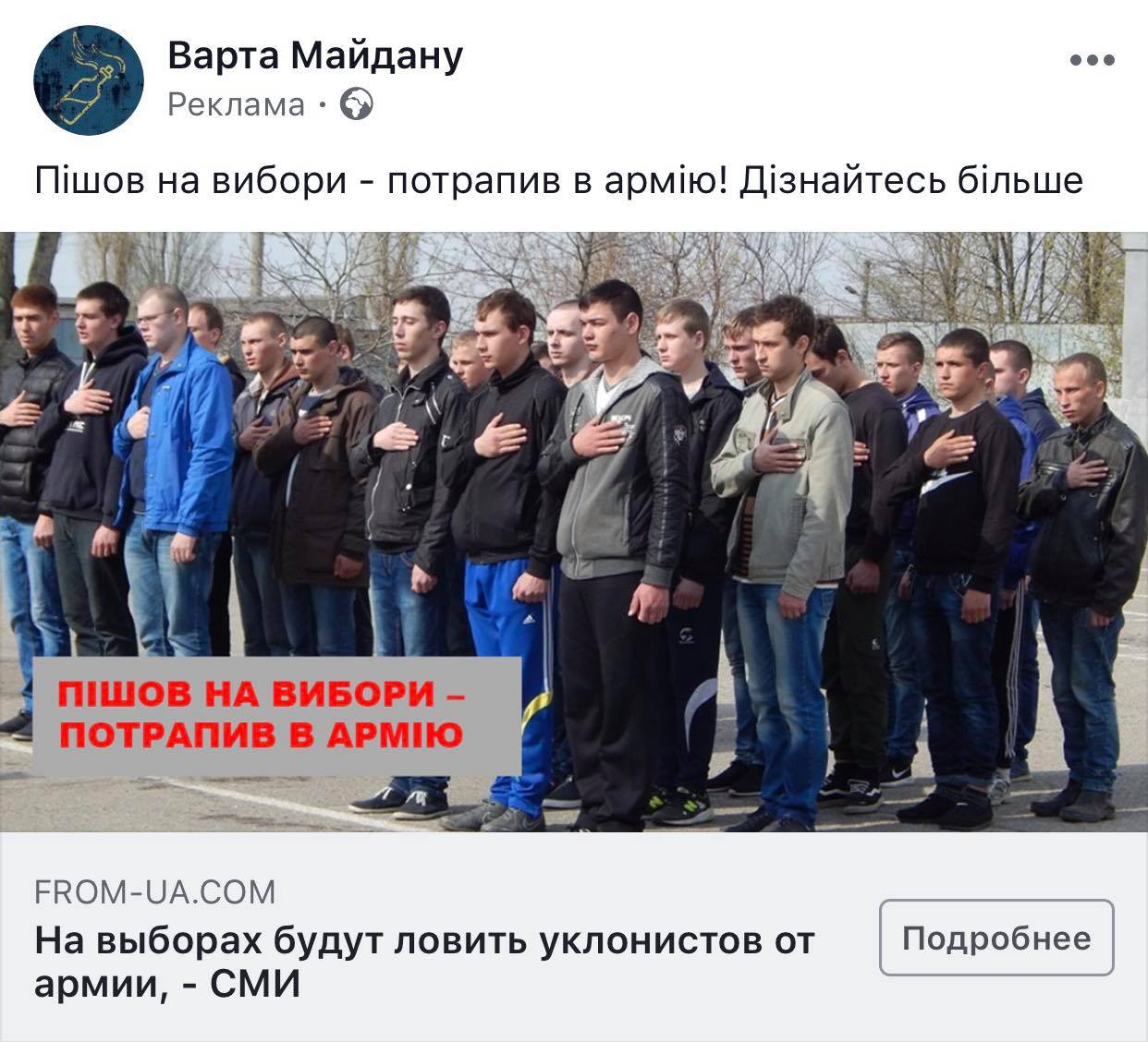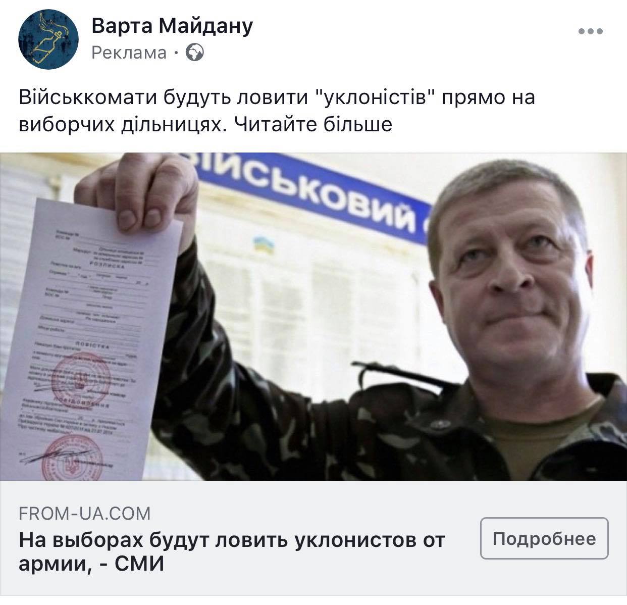 В соцсетях на страницах порохоботских групп (проплаченных пользователей, агитирующих за президента Петра Порошенко) массово репостят фейковую новость о том, что военкоматы якобы будут отлавливать уклонистов от призыва на военную службу прямо на избирательных участках 31 марта.