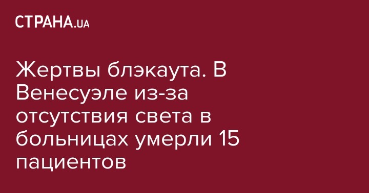 Пятнадцать венесуэльцев с тяжелыми болезнями почек умерли из-за невозможности проведения им процедуры гемодиализа во время масштабного отключения электроэнергии в Венесуэле. Такие данные приводит Коалиция организаций за право на здоровье и жизнь Codevida health rights group, как сообщает "Радио Свобода".